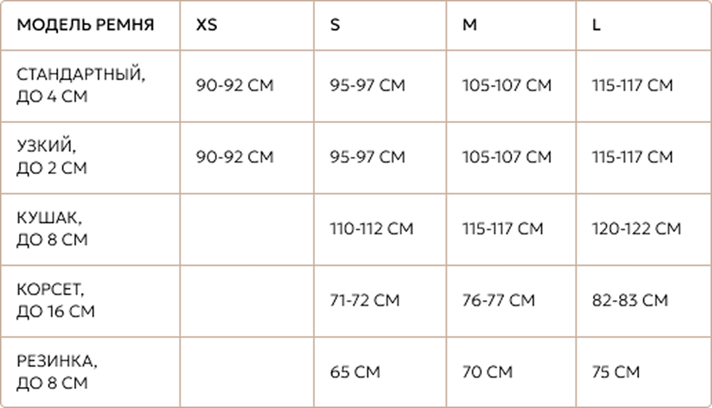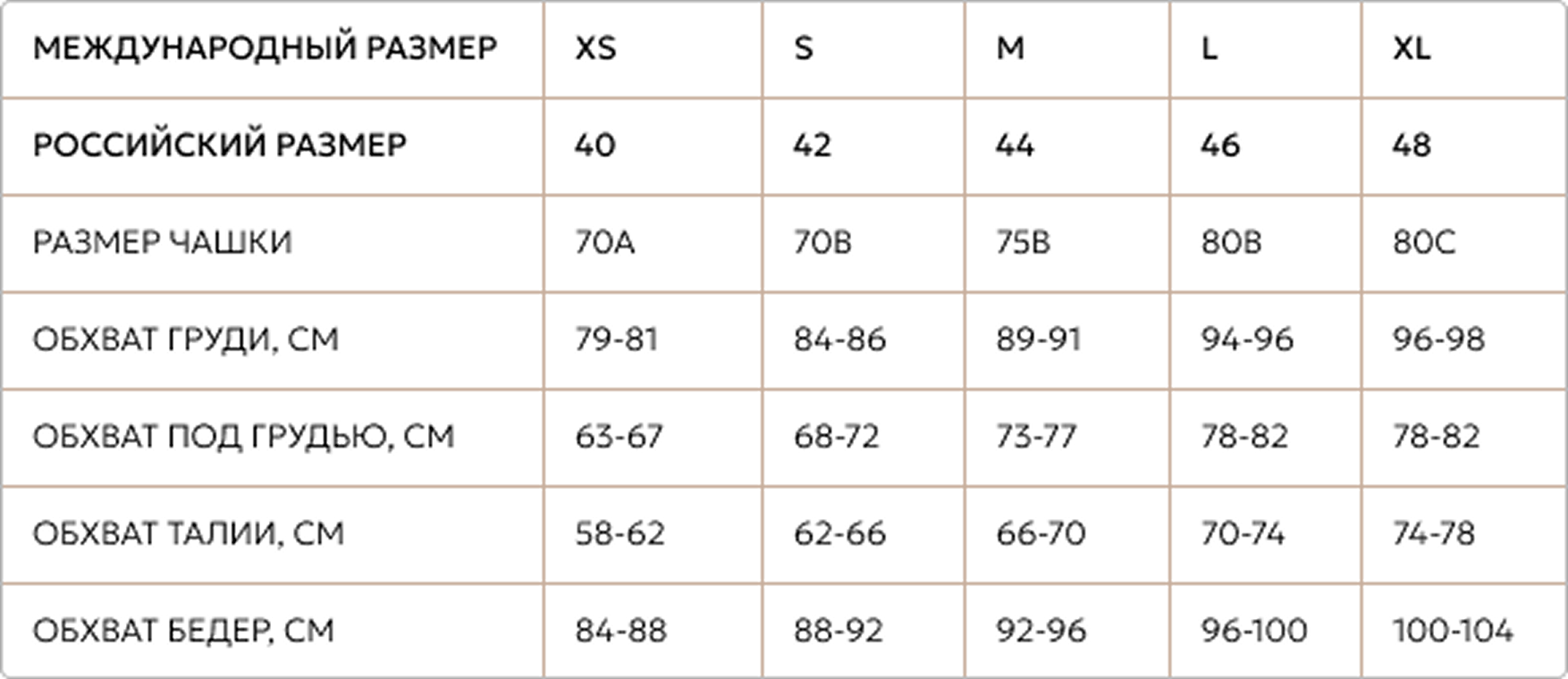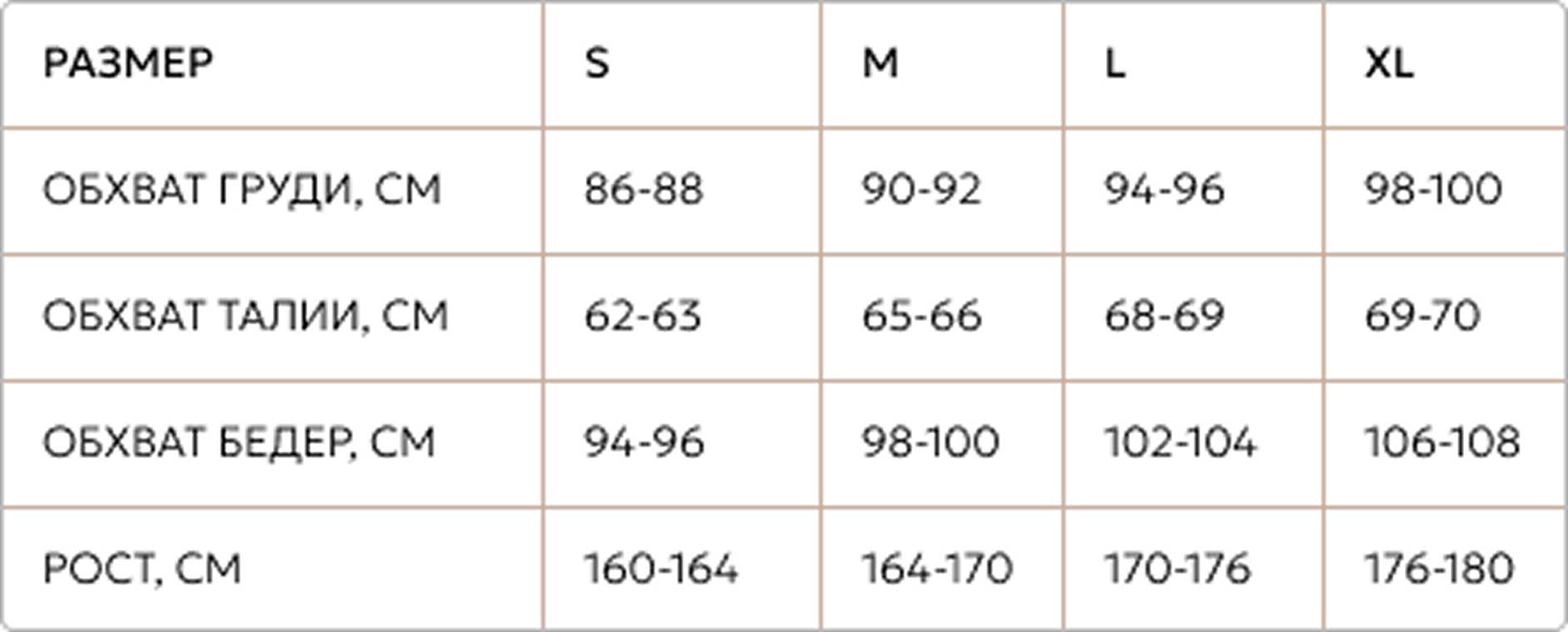 Соотнеси полученные данные с размерной сеткой в таблице. Если твой показатель — это среднее между двумя величинами, рекомендуем выбрать большую.