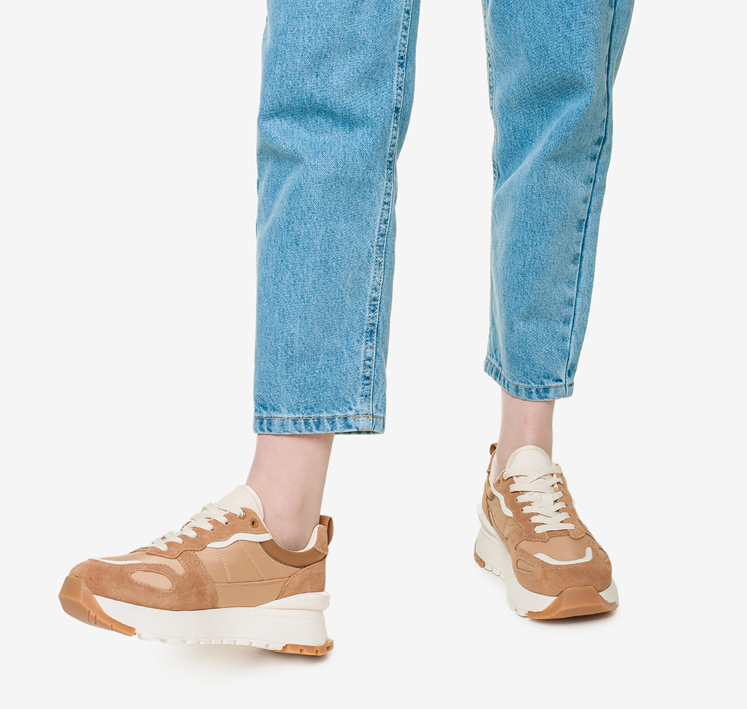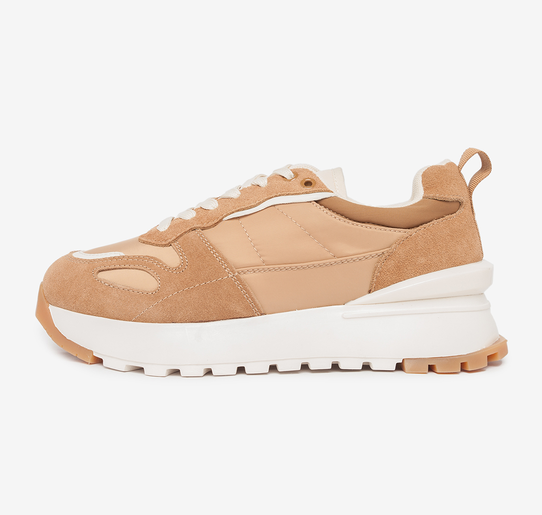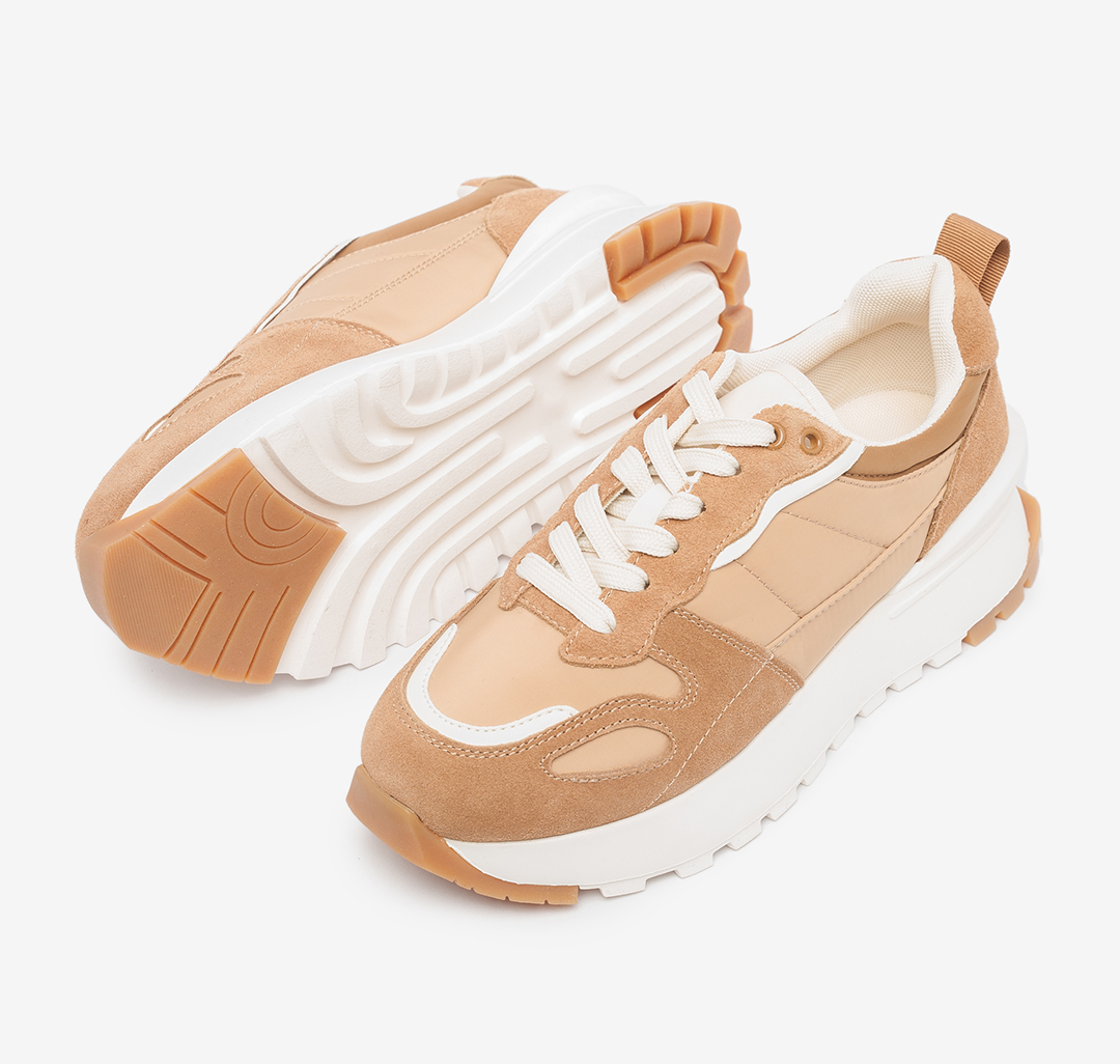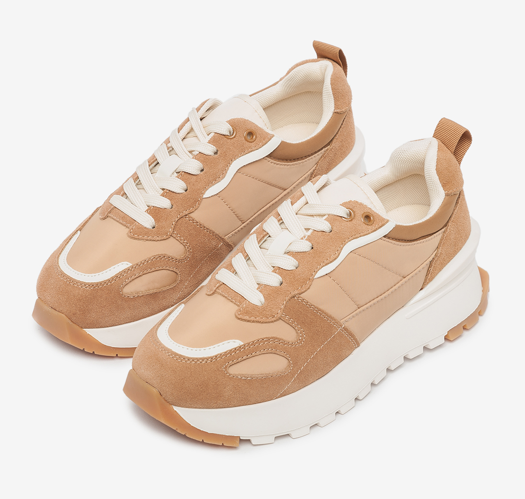 Помимо оттенков, в этих кроссовках комбинируются и материалы: кожа (спилок) и текстиль, гладкая и замшевая фактура. Такое сочетание выглядит интересно, приковывает взгляды и гармонично дополнит любой аутфит.