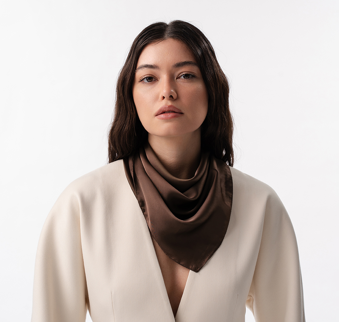 Лаконичный платок в универсальном бежевом цвете, со стильным металлическим отливом. Такой аксессуар можно использовать десятком разных способов: не только повязать на голову или шею, но также дополнить платком прическу (например, вплести в косу), или обвязать вокруг ручки любимой сумки.