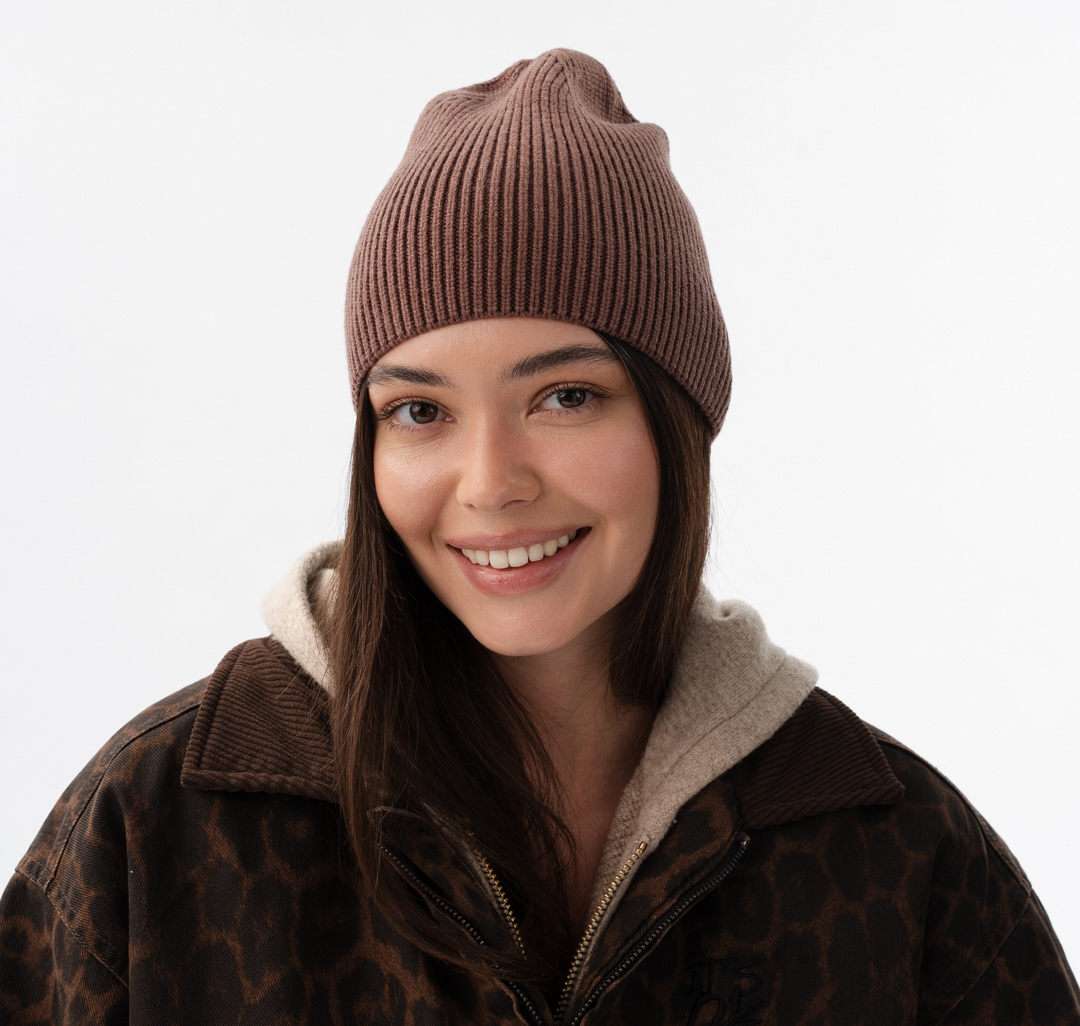 Такой головной убор универсален — и не только благодаря расцветке и самому популярному фасону. Можно носить шапку так, как хочется: с подворотом или без, высоко на макушке или опуская на лоб и уши. Какой бы вариант ты ни выбрала, модель будет плотно прилегать и хорошо держать форму.