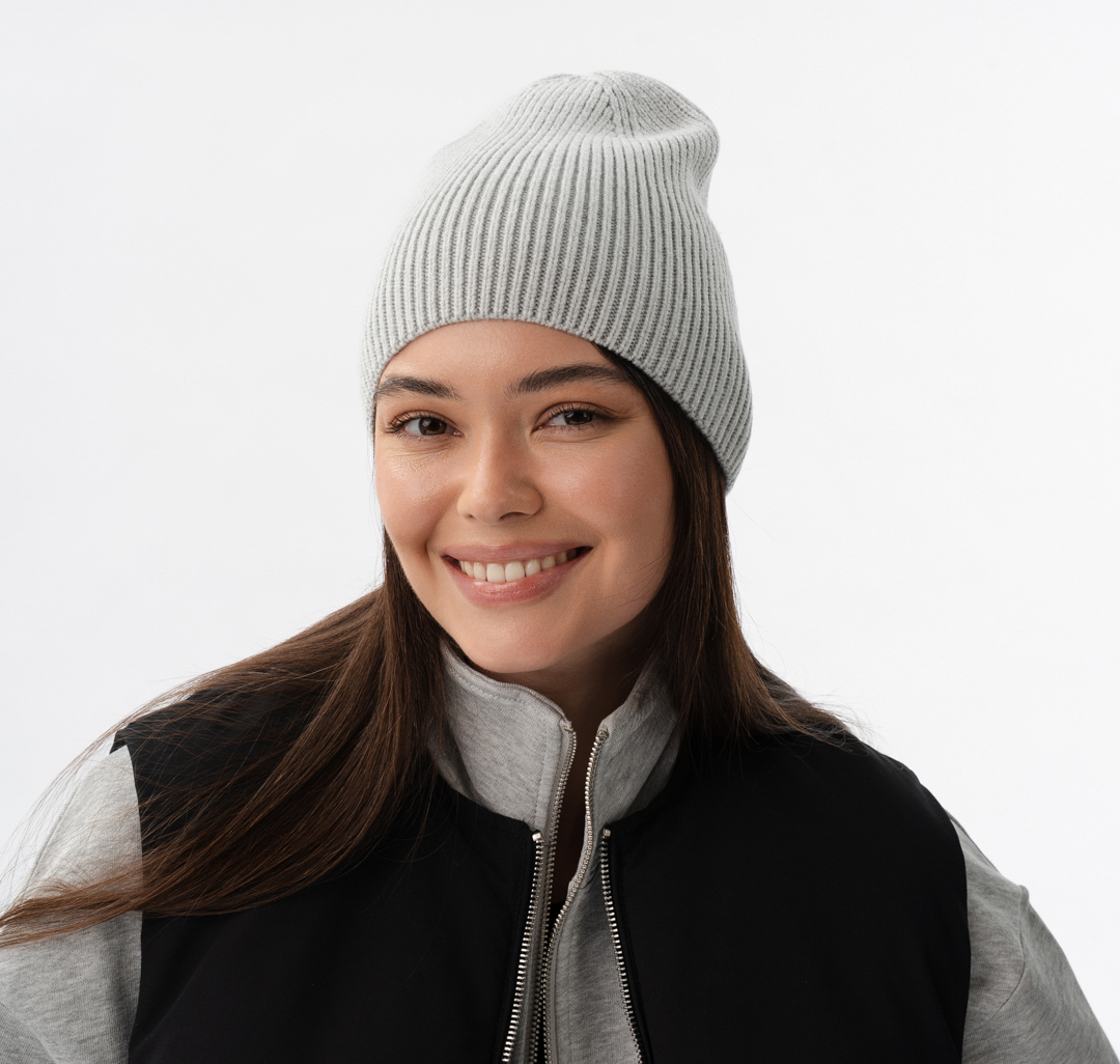 Такой головной убор универсален — и не только благодаря расцветке и самому популярному фасону. Можно носить шапку так, как хочется: с подворотом или без, высоко на макушке или опуская на лоб и уши. Какой бы вариант ты ни выбрала, модель будет плотно прилегать и хорошо держать форму.