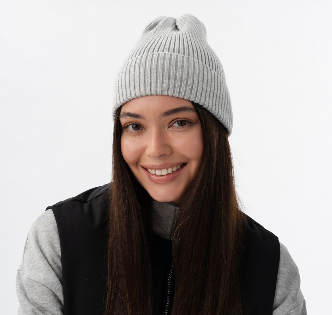 Классическая фактура в рубчик и самый популярный фасон делают эту шапку универсальной, её можно сочетать с любой верхней одеждой. А благодаря регулируемому подвороту легко меняются пропорции модели, и она подходит для всех форм лица без исключения.
