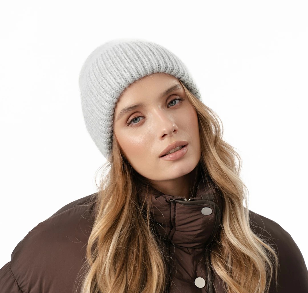 Шапка-бини с добавлением нежной ангоры. Это базовая модель с отворотом, с классической фактурой в мелкий рубчик. Модель доступна в нескольких нейтральных цветах.