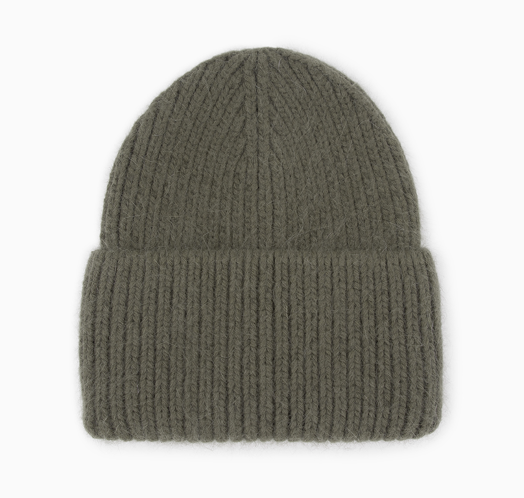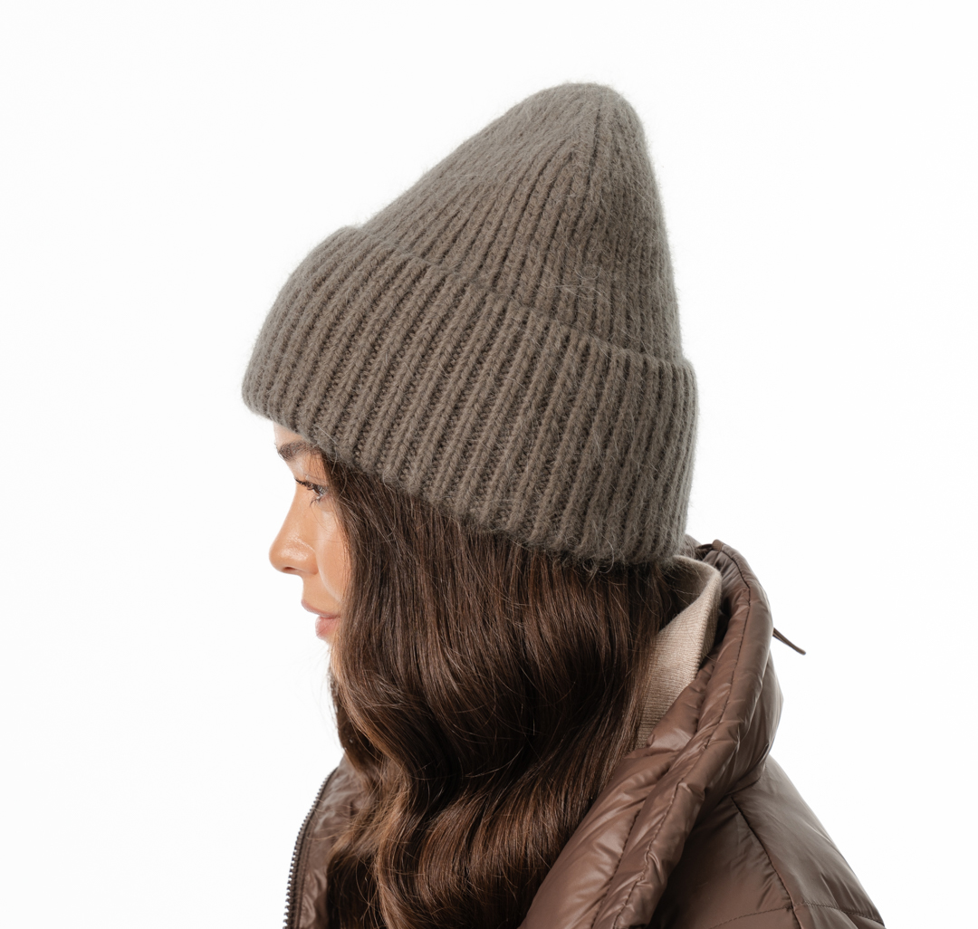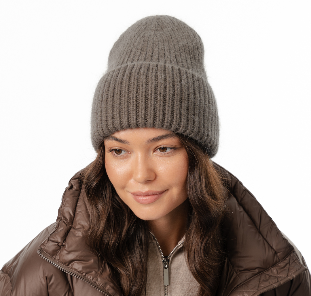 Шапка-бини с добавлением нежной ангоры. Это базовая модель с отворотом, с классической фактурой в мелкий рубчик. Модель доступна в нескольких нейтральных цветах.