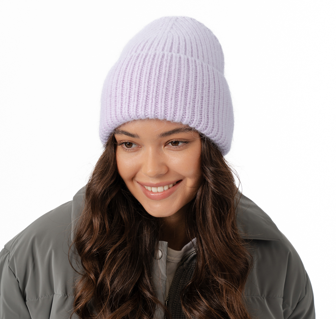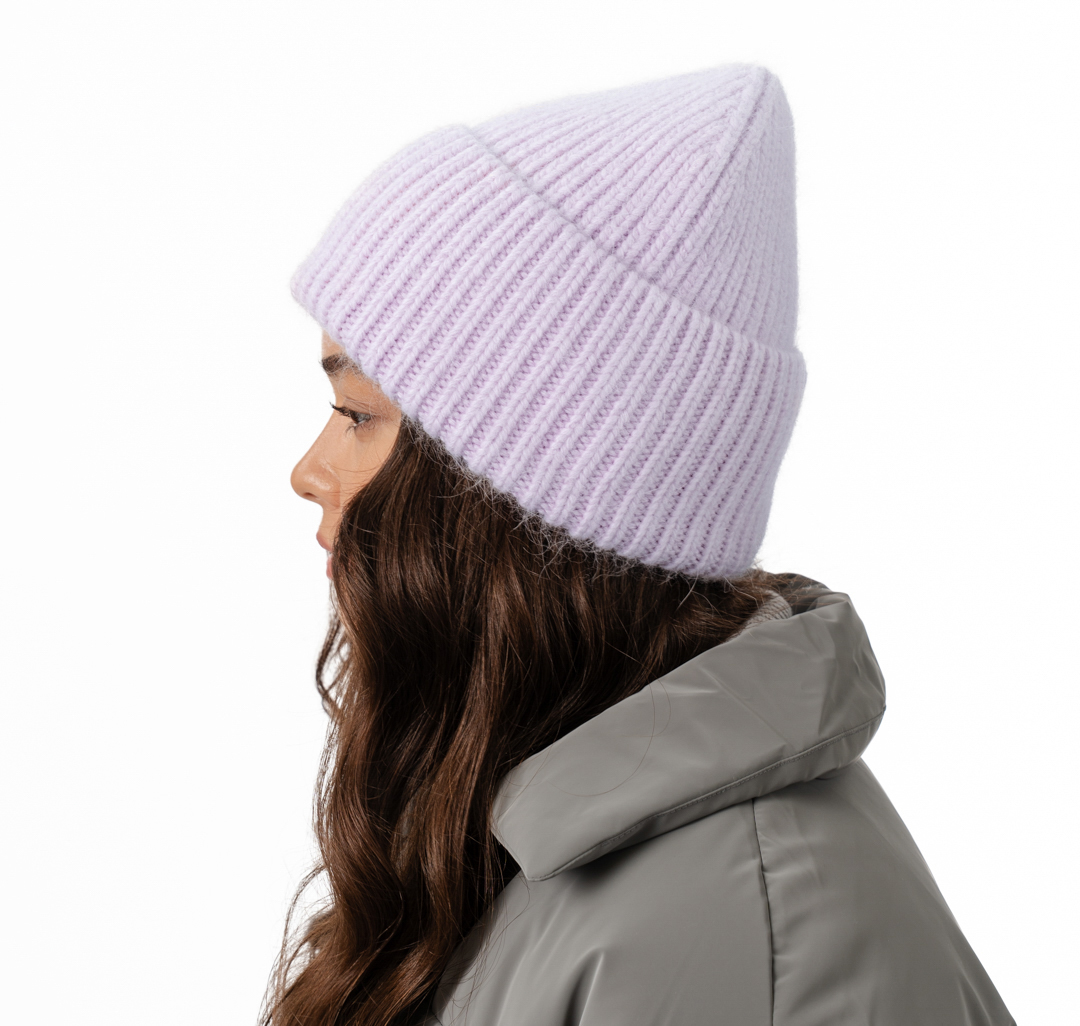 Шапка-бини с добавлением нежной ангоры. Это базовая модель с отворотом, с классической фактурой в мелкий рубчик. Модель доступна в нескольких нейтральных цветах.