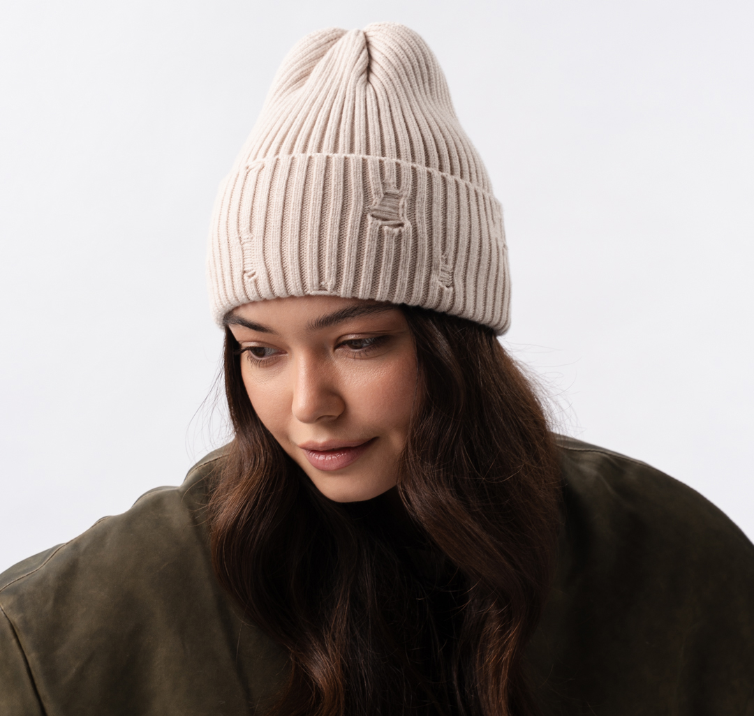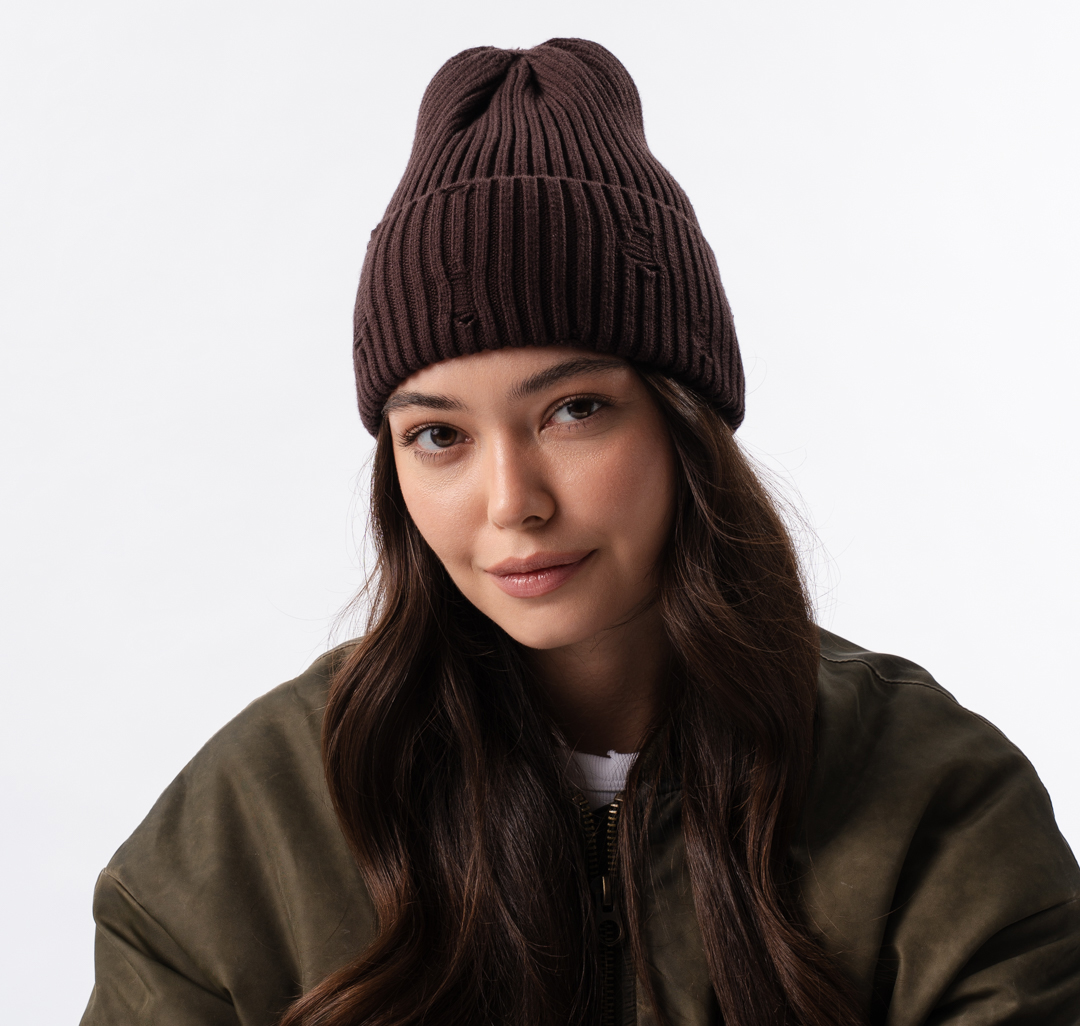Шапка-бини с широким отворотом и трендовыми люверсами смотрится смело и оригинально. Она добавляет образу бунтарский вайб и делает даже базовый комплект более выразительным.