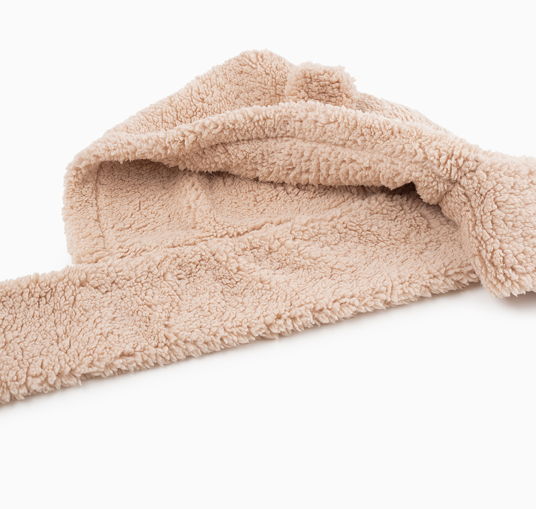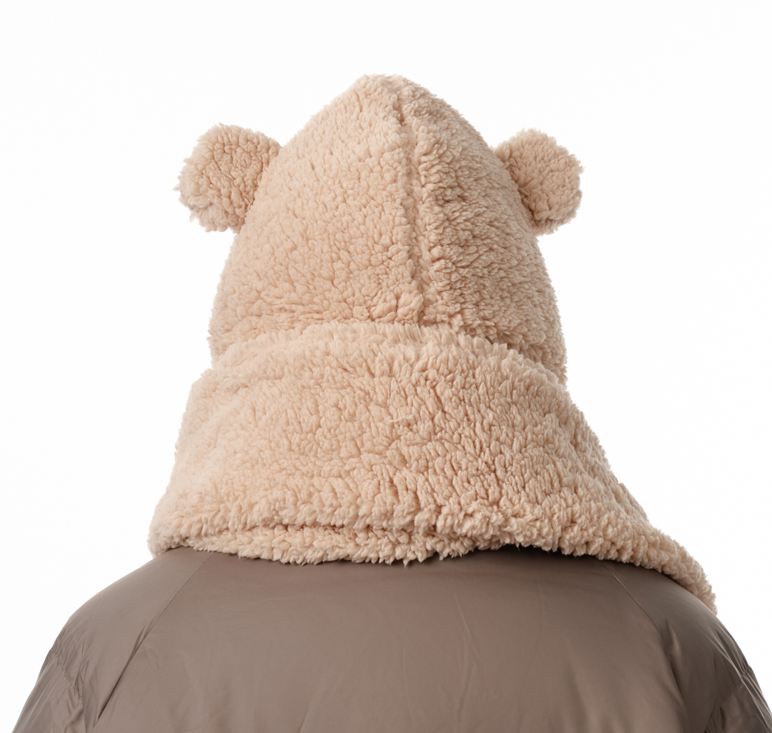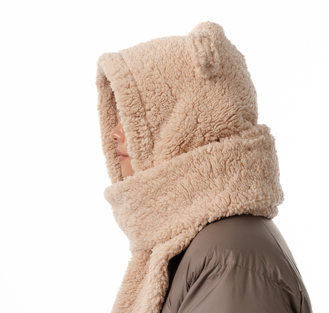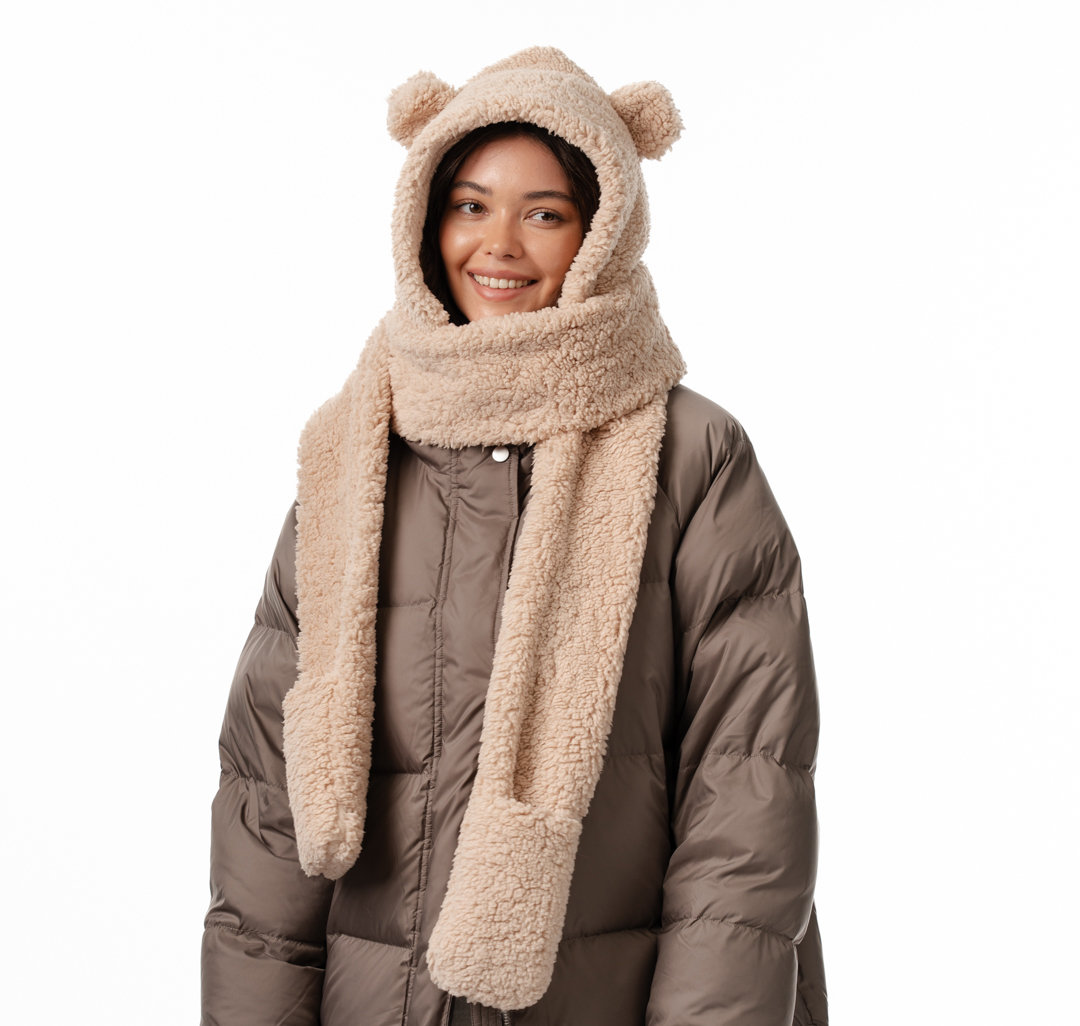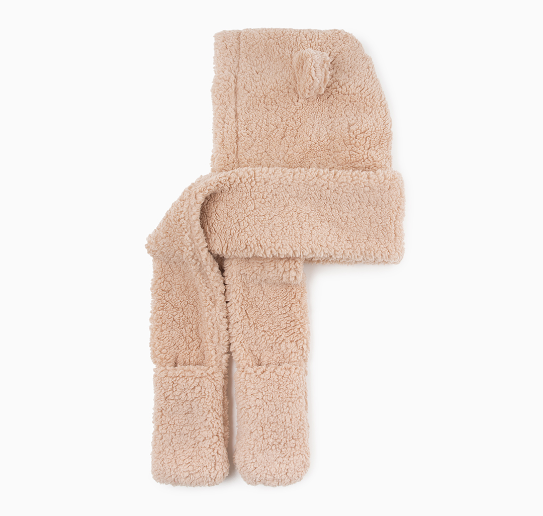 Дизайнеры MARMALATO стилизовали шапку в виде головы плюшевого медвежонка. Модель дополнена объемным шарфом и вшитыми варежками. Для изготовления аксессуара использовали мягкий нежный материал на основе прочного полиэстера.