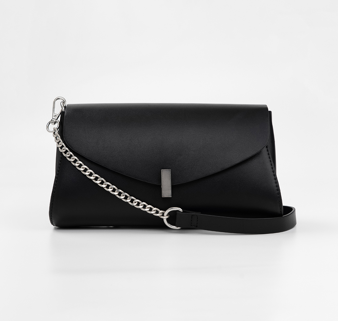Фишка модели — удобный крутящийся механизм на замке, который открывается в любую сторону. Матовая серебряная фурнитура поддерживает лаконичный образ аксессуара. Съемный ремешок с цепочкой — еще одна трендовая и при этом практичная деталь.