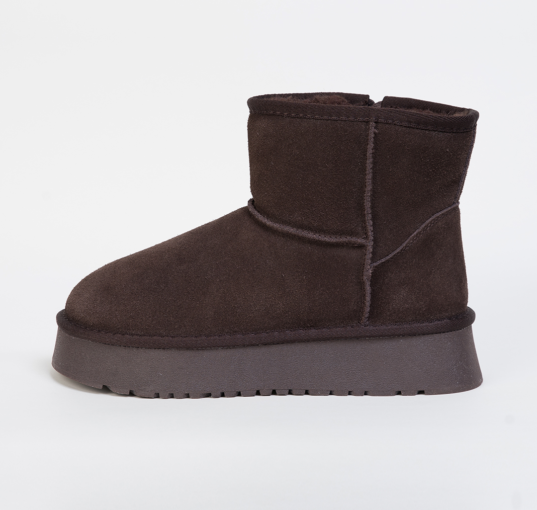 Верх модели выполнен из натурального спилка (кожа). Он устойчив к износу и механическим повреждениям, сохраняет тепло, прост в уходе и выглядит очень стильно благодаря замшевой фактуре. Подкладка и стелька из шерсти дополнительно защищают от мороза — угги можно носить до -30С.