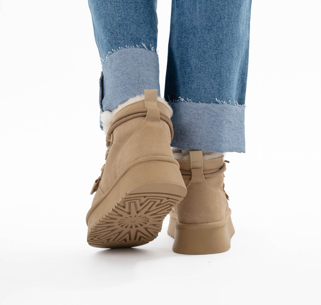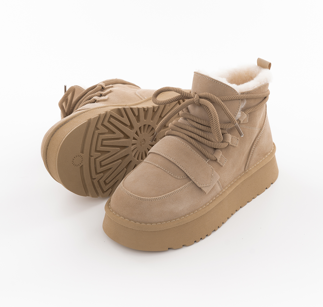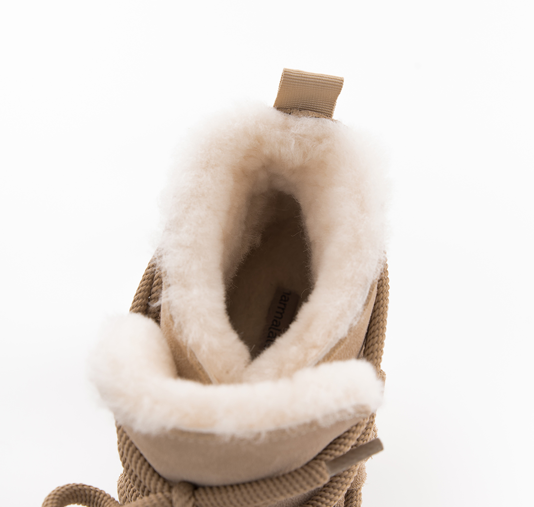 Материал модели — натуральная кожа (спилок). Он одновременно эластичный и прочный, простой в уходе и практичный. Опушка из экомеха, контрастная в некоторых из расцветок, добавляет обуви уюта. Подклад выполнен из натурального меха и овечьей шерсти (>50%), которые обеспечивают дополнительную защиту от холода. Носить эти угги можно до -30С.
