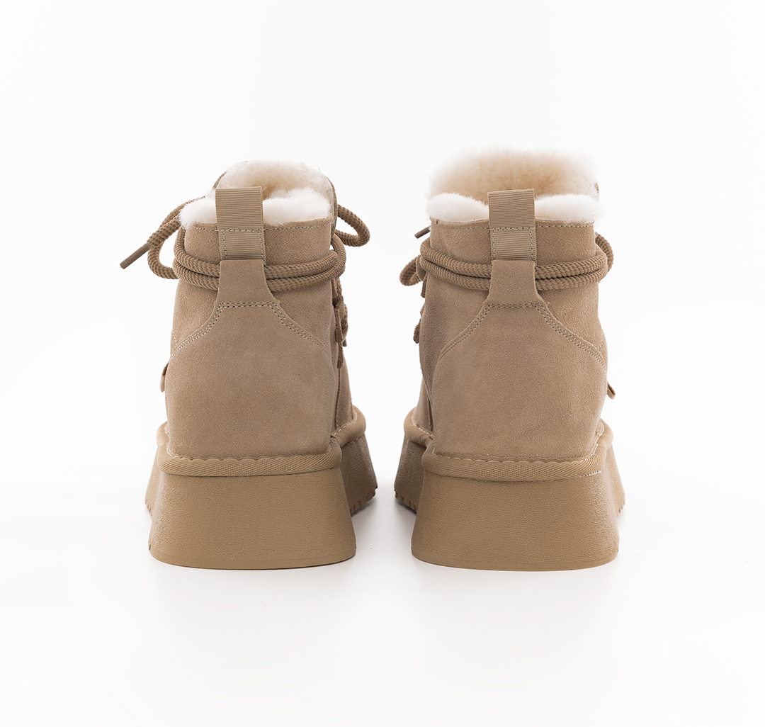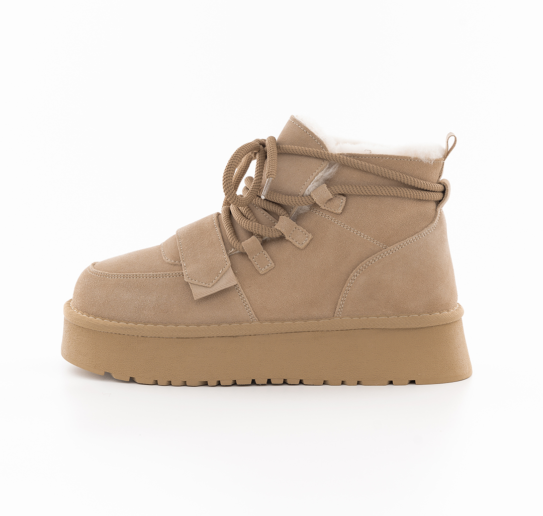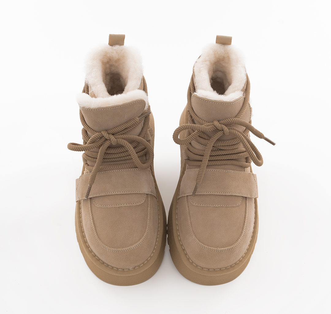 Материал модели — натуральная кожа (спилок). Он одновременно эластичный и прочный, простой в уходе и практичный. Опушка из экомеха, контрастная в некоторых из расцветок, добавляет обуви уюта. Подклад выполнен из натурального меха и овечьей шерсти (>50%), которые обеспечивают дополнительную защиту от холода. Носить эти угги можно до -30С.