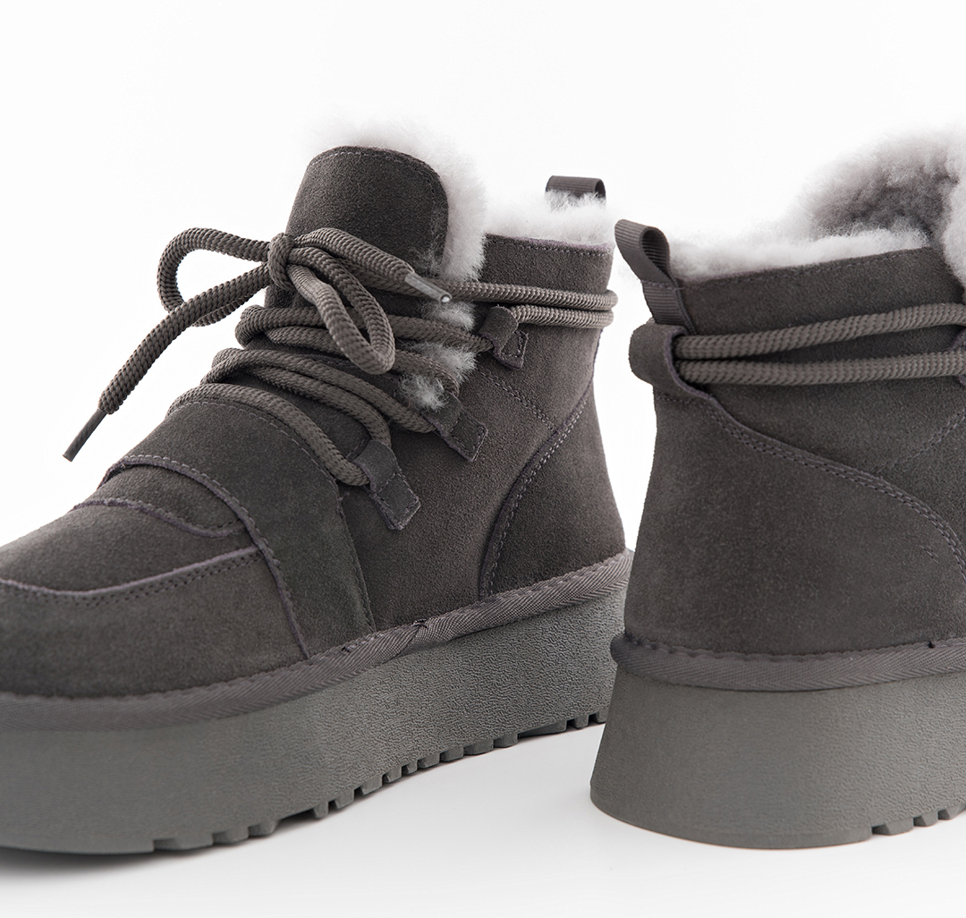 Материал модели — натуральная кожа (спилок). Он одновременно эластичный и прочный, простой в уходе и практичный. Опушка из экомеха, контрастная в некоторых из расцветок, добавляет обуви уюта. Подклад выполнен из натурального меха и овечьей шерсти (>50%), которые обеспечивают дополнительную защиту от холода. Носить эти угги можно до -30С.